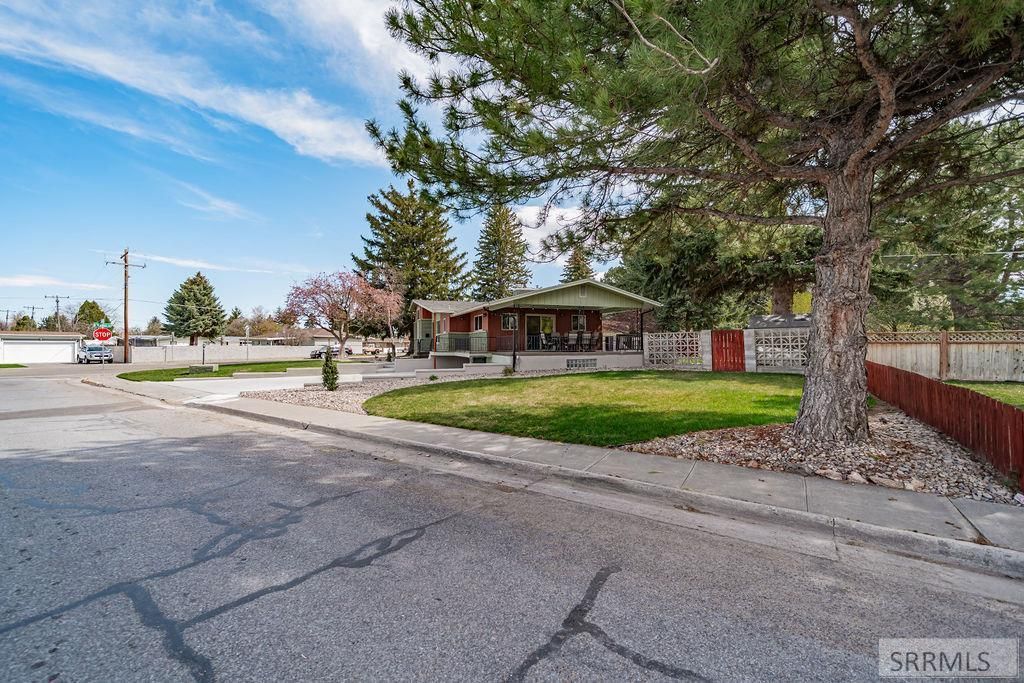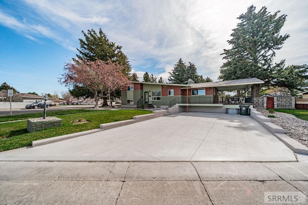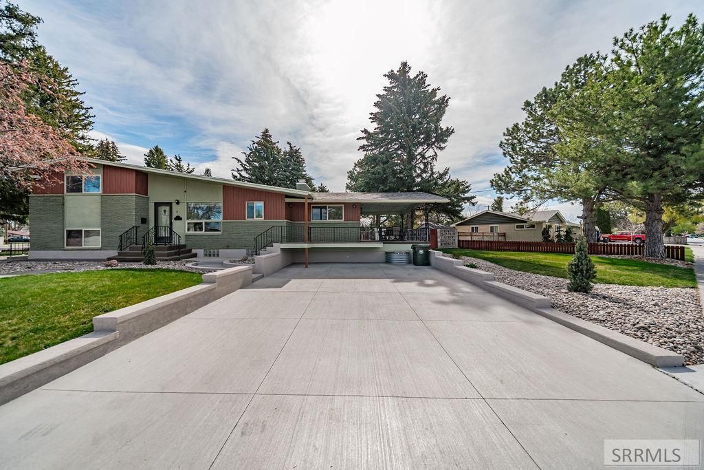 You dont want to miss this spacious, midcentury modern home located in the heart of Blackfoot on a large, corner lot. Enjoy your own private outdoor retreat with a fully landscaped yard, expansive deck with both covered and sun-filled areas, established trees and shrubs, and two storage sheds for optimal functionality. The interior has 5 bedrooms, 2.5 bathrooms, 2 fireplaces, a kitchen/breakfast nook, vaulted ceilings, brand new kitchen appliances and original features throughout. It has a thoughtfully upgraded exterior featuring a newly leveled driveway with improved drainage to prevent water intrusion, along with a sealed previous-garage for enhanced protection and extra storage. One of the basement bedrooms has an exterior entrance and could be used for an office. Schedule your showing today!