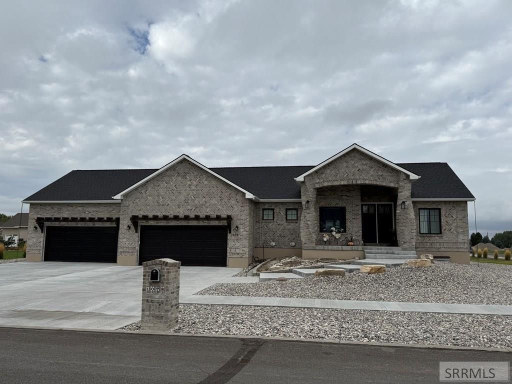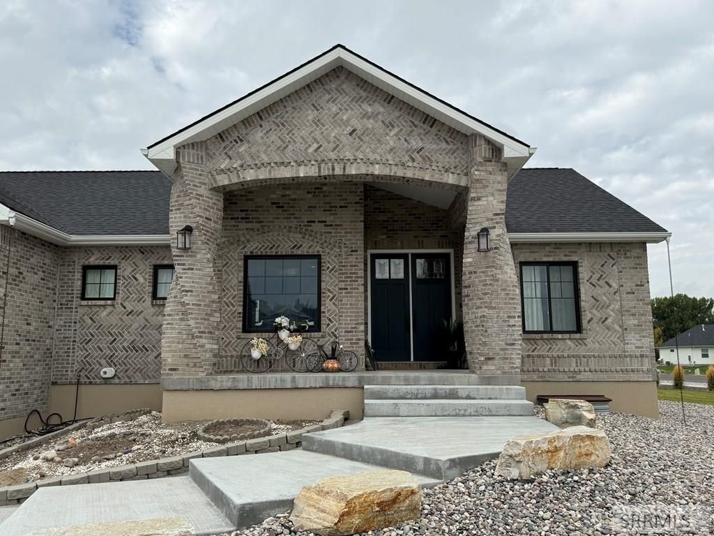 Spiral piers are the focal point of the double door grand entry to this custom built all brick home accented by an attached enclosed sky blue sunroom teeming with natural light. An open floor plan on the main level features a large kitchen, living room, and dining room with hand-scraped hickory hardwood floors throughout including the stairway, an attached den/study/office, and access to the attached sunroom. An open spacious kitchen includes colorful glazed cabinetry with quartz countertops, specialized black metallic hardware, high-end KitchenAid appliances, large breakfast bar, and walk-in pantry with appliance storage and natural light. The main level master suite features more hickory hardwood, custom tiled shower, built-in storage, and an extra large walk-in closet. The basement master suite also features a custom tiled bathroom and large walk-in closet. Each level has an additional full guest bathroom. The main floor laundry/mudroom with mosaic tile leads to a large 4 car garage with heated concrete. Additionally, this unique home includes a Rexburg winter snow melt system in the driveway/front stairs with commercial boilers, backup generator, water filter, water softener, central vacuum, storage, community pond, golf course access, and custom landscape.