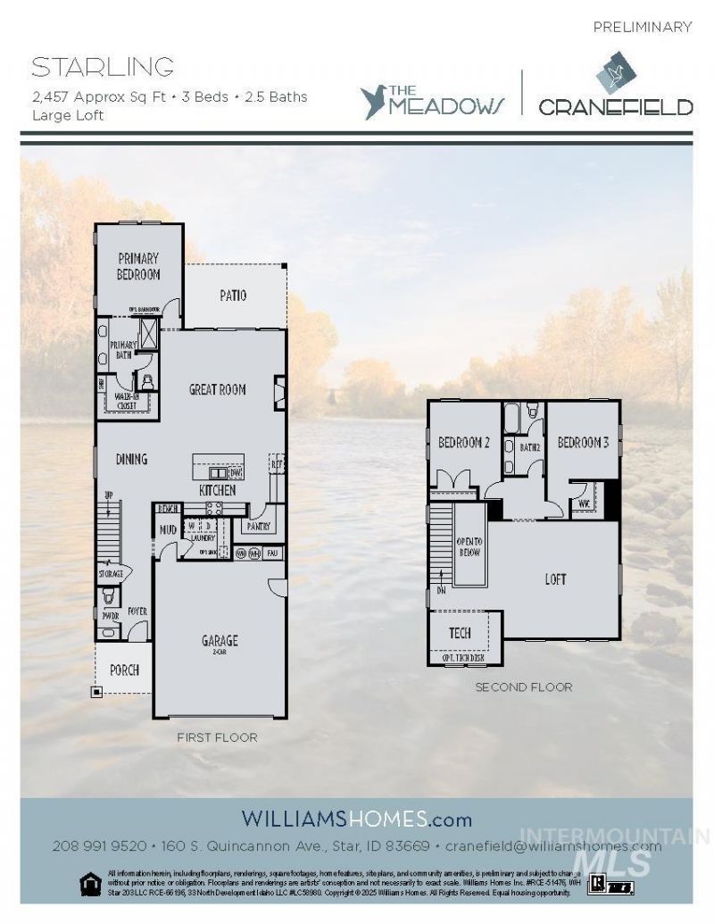 The Starling at Cranefield by Williams Homes encompasses approximately 2,457 square feet of thoughtfully designed living space. This elegant home features 3 spacious bedrooms and 2.5 bathrooms, providing the perfect blend of comfort and style. The main floor boasts a luxurious primary suite, creating a serene retreat with an en-suite bathroom and ample closet space. The gourmet kitchen, equipped with stainless steel appliances and a walk-in pantry, flows seamlessly into the great room. The mudroom and laundry room off the 2-car garage ensure your home stays organized and clutter-free. The second-floor features two additional bedrooms, each offering cozy and private spaces. An oversized loft provides versatile space for a play area, media room, or additional living space. The open office provides a functional addition to the home. Community amenities include: pond access, walking trails, pickleball court, and community pool. Models + Open House daily 10am-6pm.