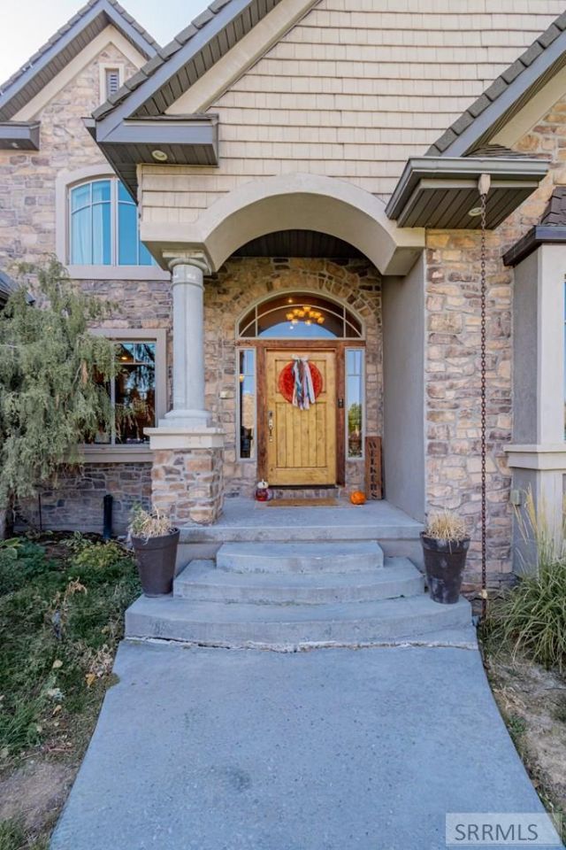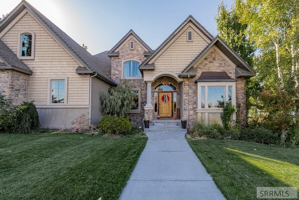 Set in one of Rexburgs most sought-after neighborhoods, this home stands with quiet confidence, framed by mature trees, a wide stretch of lawn, and a sense of space that is hard to replicate. A stone facade and welcoming entry lead inside to a striking staircase and detailed wall work that immediately set the tone. Natural light fills the main living area, where tall ceilings, expansive windows, and a stone fireplace create a space that feels both open and grounded, with uninterrupted views stretching across open fields. The kitchen is designed to gather, anchored by rich wood cabinetry, generous workspace, and an easy connection to the dining area and living room. The main level primary suite offers a comfortable retreat with space to breathe and a private bath. Upstairs and down, six bedrooms and multiple living areas provide flexibility for everyday living and hosting alike. The lower level opens wide with room for games, movies, and long evenings with friends. Outside, the .72 acre lot gives you distance from neighbors and a backyard that feels calm and expansive, complete with a covered patio and elevated deck to take in the views. A paid off solar system adds lasting value to a home that pairs space, setting, and livability in a way that rarely comes available.